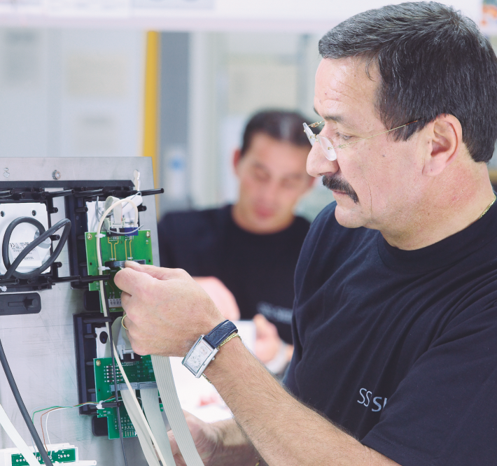 Fotos von Mitarbeitern in ihrem Arbeitsumfeld geben Einblick in das Unternehmen Siedle und zeigen: Es ist möglich, in Deutschland konkurrenzfähige Produkte herzustellen, wenn mit Kreativität und Engagement für dieses Ziel gearbeitet wird.