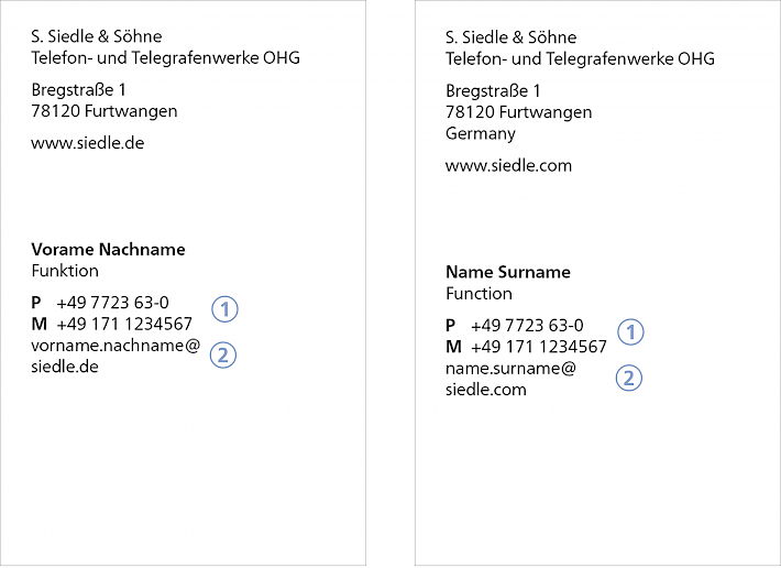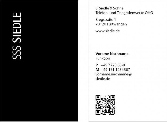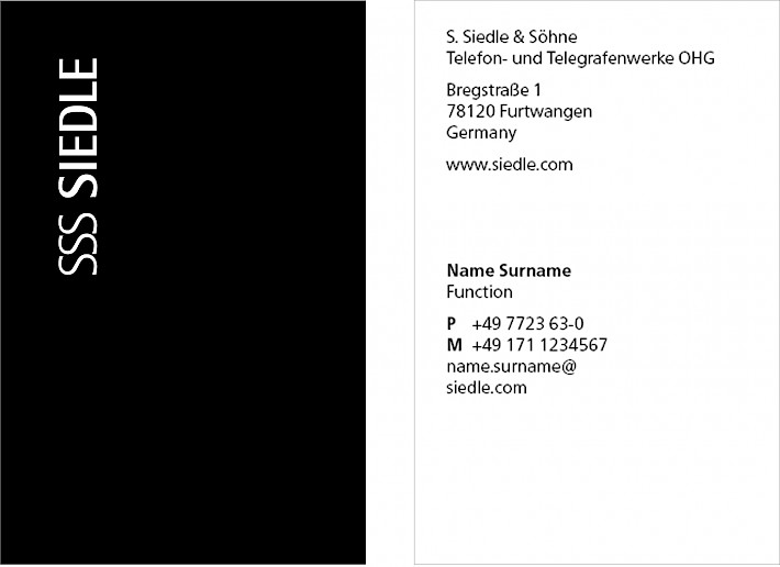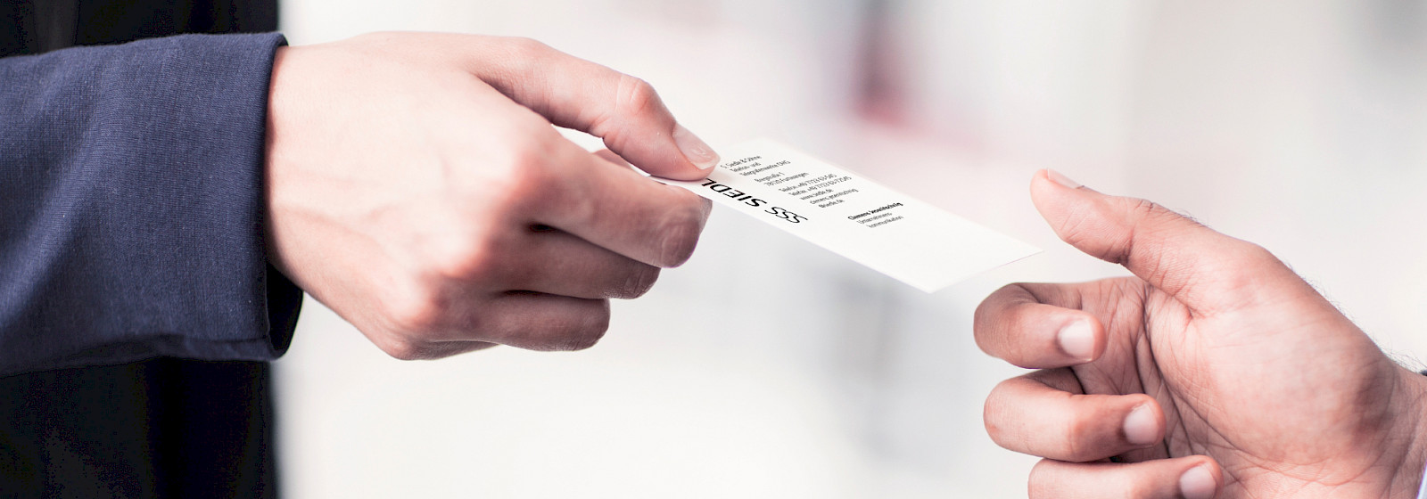 Die Standardausführung der Siedle-Visitenkarte besteht aus einer bedruckten Vorderseite und einer weißen Rückseite. Die Bestellung der Visitenkarten und die Vorgaben in Bezug auf Funktionsbeschreibung erfolgen in Abstimmung mit dem Personalwesen. Ein Anforderungsformular hierfür finden Sie im Downloadbereich.