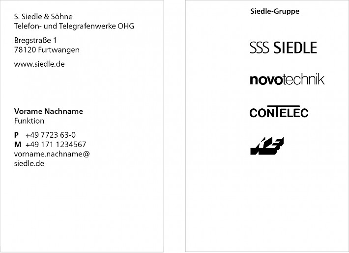 Die Vorderseite entspricht der Standardausführung der Siedle-Visitenkarte. Auf der Rückseite werden die Logos der einzelnen Unternehmen der Siedle-Gruppe aufgezeigt.