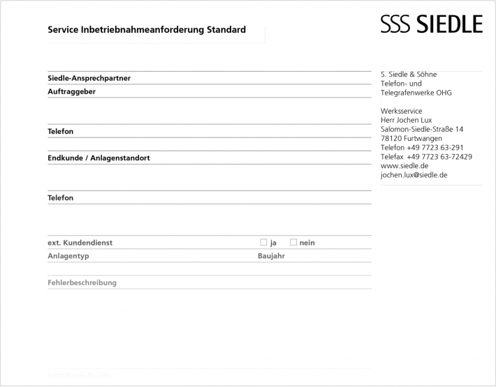 Grundlage für jedes Formblatt ist ein einheitlicher Formularkopf mit dem Logo. Das Siedle-Logo wird als Bild importiert und kann nur proportional in der Größe verändert werden. Wenn ein Logo in ein Dokument eingebettet werden soll, muss es als komplettes Bild, proportional transformiert werden bis die angestrebte Größe erreicht ist.