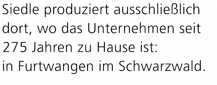 „SSS“ kommt nur im Siedle-Markenzeichen vor. In normalem Text wird „Siedle“ geschrieben. Beispiel: Siedle produziert ausschließlich dort, wo das Unternehmen seit 275 Jahren zuhause ist: in Furtwangen im Schwarzwald.