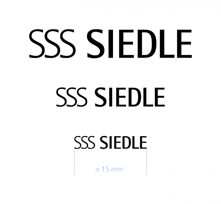 Das Markenzeichen besteht aus dem Buchstabenzeichen „SSS“ und dem Schriftzug „Siedle“. Es wird nur in der Originalform eingesetzt. Die Kombination und die Proportion von Buchstabenzeichen und Schriftzug werden nicht variiert.